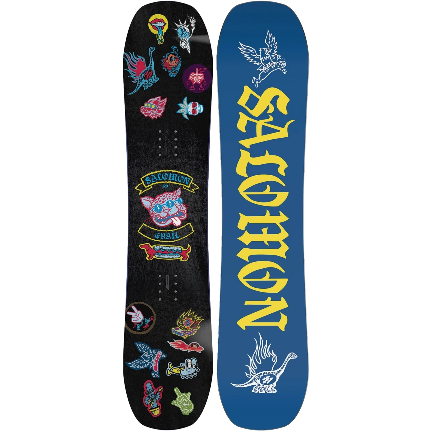 The 2024 Salomon Grail is an entry level snowboard designed to give boys the best possible start to snowboarding. With a super flat design, soft flex, and concave Bowl Skate Base, the Grail will make those turns come easier and quicker with less falls and more smiles.